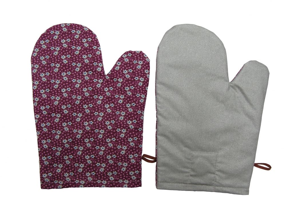 Kuchyňské chňapky s všitým magnetem a bočním poutkem pro zavěšení. Svrchní materiál bavlna vzor mini kytičky v červené, fialové, nebo petrolejově modré barvě, dlaňová strana ALUTEX (materiál odvádějící teplo). Rozměry 27x17cm.