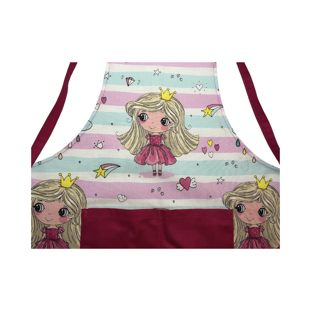 Dětská laclová zástěra ušitá ze 100% bavlny, vzor duhové princezny, tři velikosti - viz varianty. Dvě větší velikosti v pase i za krkem zavazovací na 1,5cm široké šité tkanice. Nejmenší na gumičky /s knoflíky/ překřížené na zádech a zapínací v pase do dírek. Vhodná jak na vaření, tak na výtvarnou výchovu či jiné tvořivé kroužky ve školce nebo škole. Ze stejného materiálu ušijeme na přání i dětské chňapky, nebo dámskou zástěru. Doporučená teplota praní 40°C.