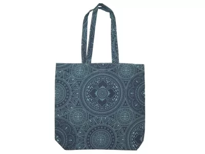 Lehce složitelná látková nákupní taška přes rameno, se stále oblíbeným vzorem mandal, tentokrát v odstínech modré. Ekologicky přátelská náhrada igelitových tašek :). Ušitá v rozměrech 40x45cm s délkou ucha cca 60cm s odšitým dnem o šířce 8cm. Materiálové složení 55% bavlna + 45% PES. Doporučená teplota praní 40°C. Vzhledem k velikosti vzoru se mohou tašky lišit.