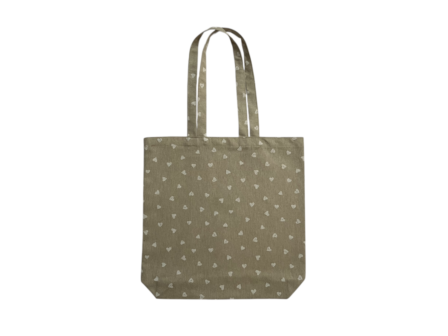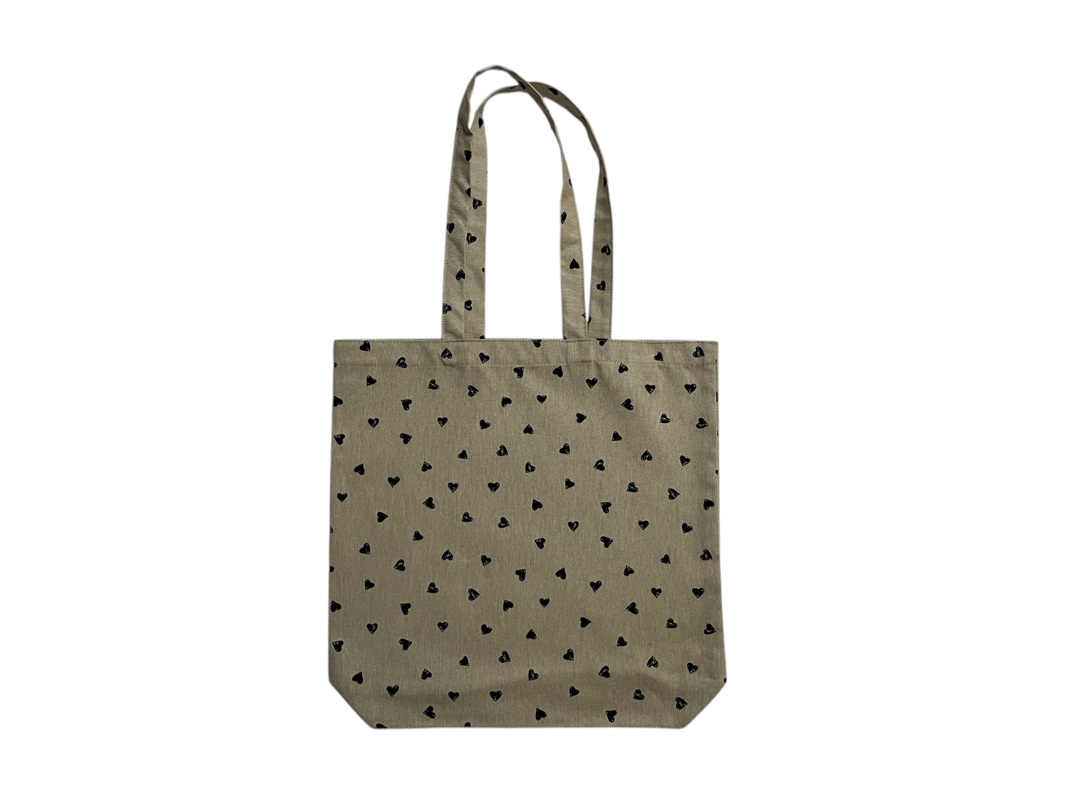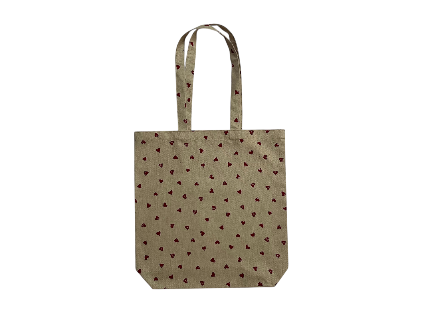 Lehce složitelná látková nákupní taška přes rameno s motivem červených, bílých, nebo černých srdíček na režném podkladu. Ekologicky přátelská náhrada igelitových tašek :). Ušitá v rozměrech 40x45cm s délkou ucha cca 60cm s odšitým dnem o šířce 8cm. Materiálové složení 80% bavlna + 20% PES. Doporučená teplota praní 40°C.